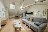 La vaste pièce de vie, avec ses meubles modernes, sa belle hauteur sous plafond et ses poutres apparentes, crée une ambiance conviviale et chaleureuse. La cuisine ouverte, aménagée et équipée (réfrigérateur, plaque de cuisson, four, hotte, etc.), est à la fois fonctionnelle et élégante.