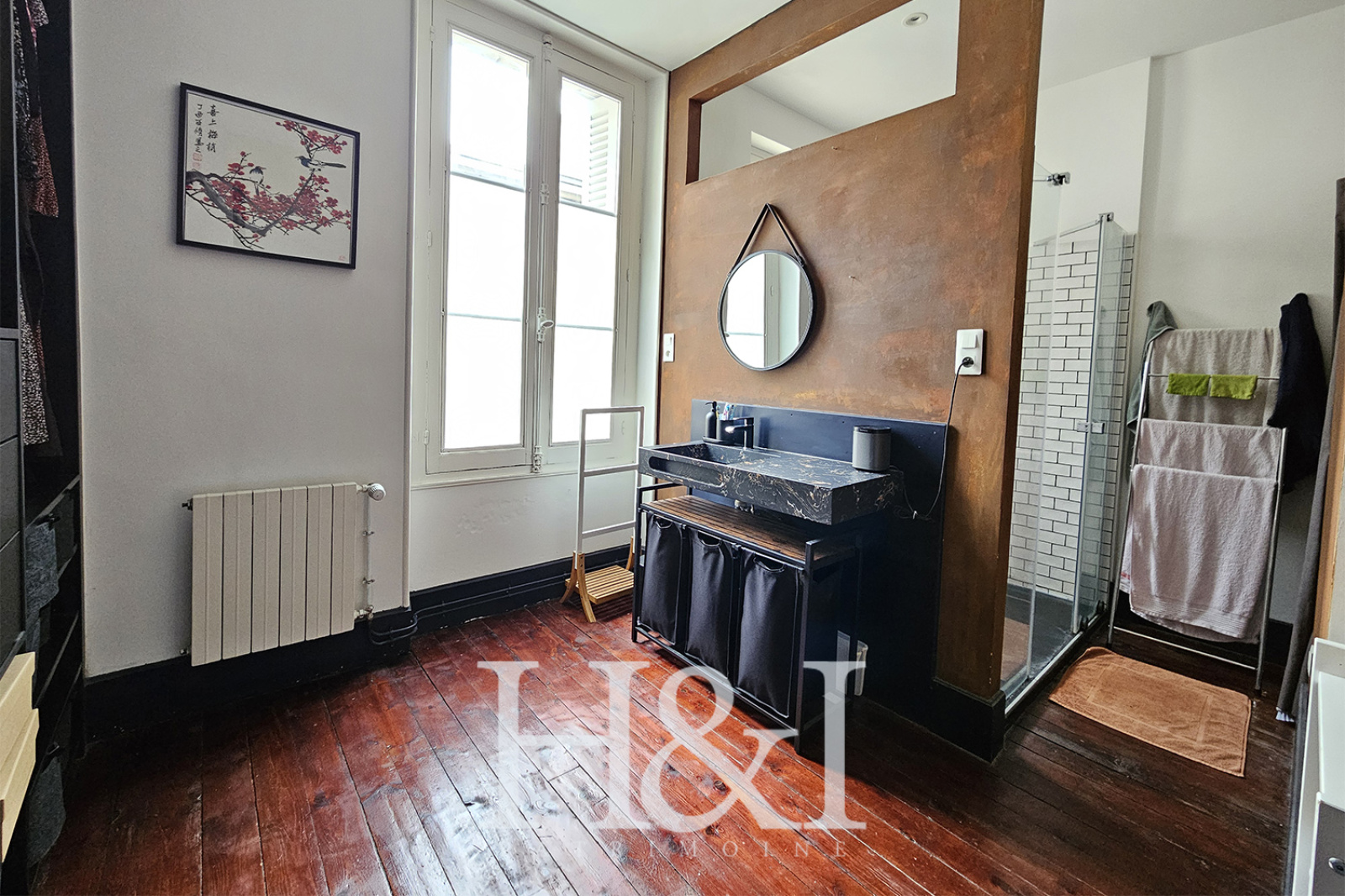 Au premier étage, le palier dessert une chambre, une vaste salle d'eau contemporaine avec grand dressing et un WC séparé.